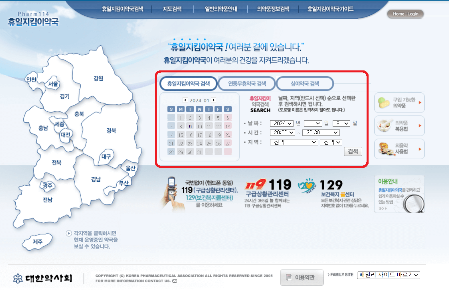 공휴일 24시 약국 찾기 (휴일지킴이)