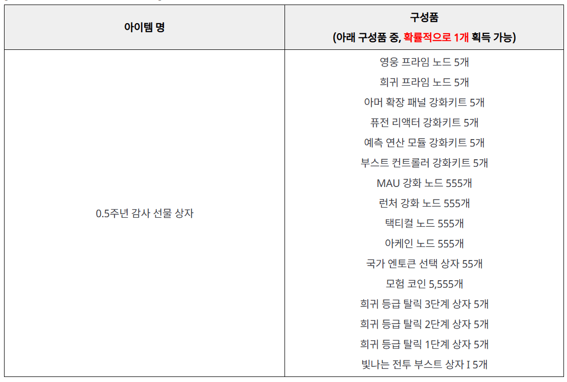 게임 내 출석만 하면 '0.5주년 감사 선물 상자'와 '영웅 로버 소환권'을 받을 수 있어요.